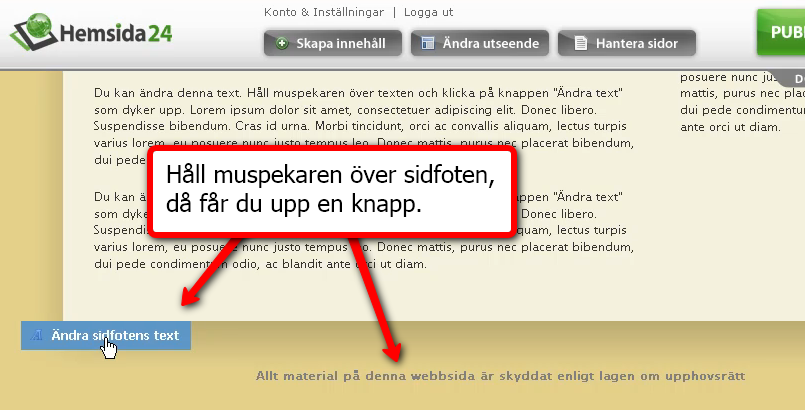 Vet du om att du kan ändra din hemsidas sidfot? Sidfoten är texten allra längst ner på din hemsida. Där kan du med fördel lägga in t ex kontaktinformation och en länk till din kontakt-sida.